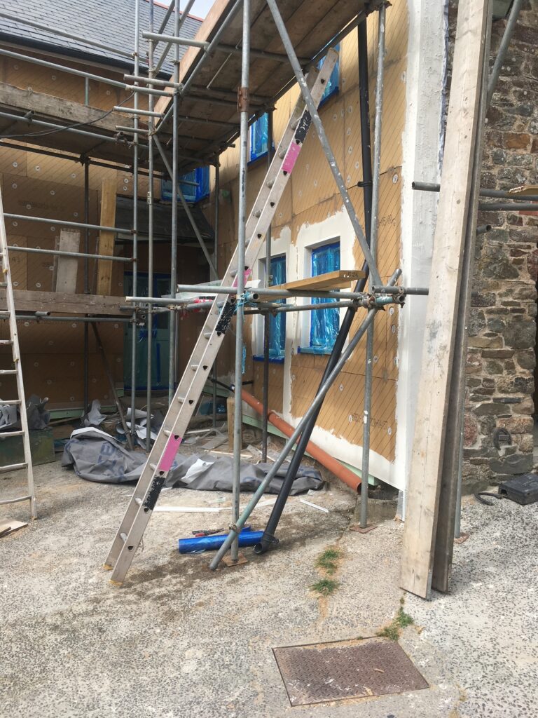 After the walls have been clad in wood fibre boards, it can then be given a base coat of plaster, followed by a mesh and then finished with a final coat of plaster.